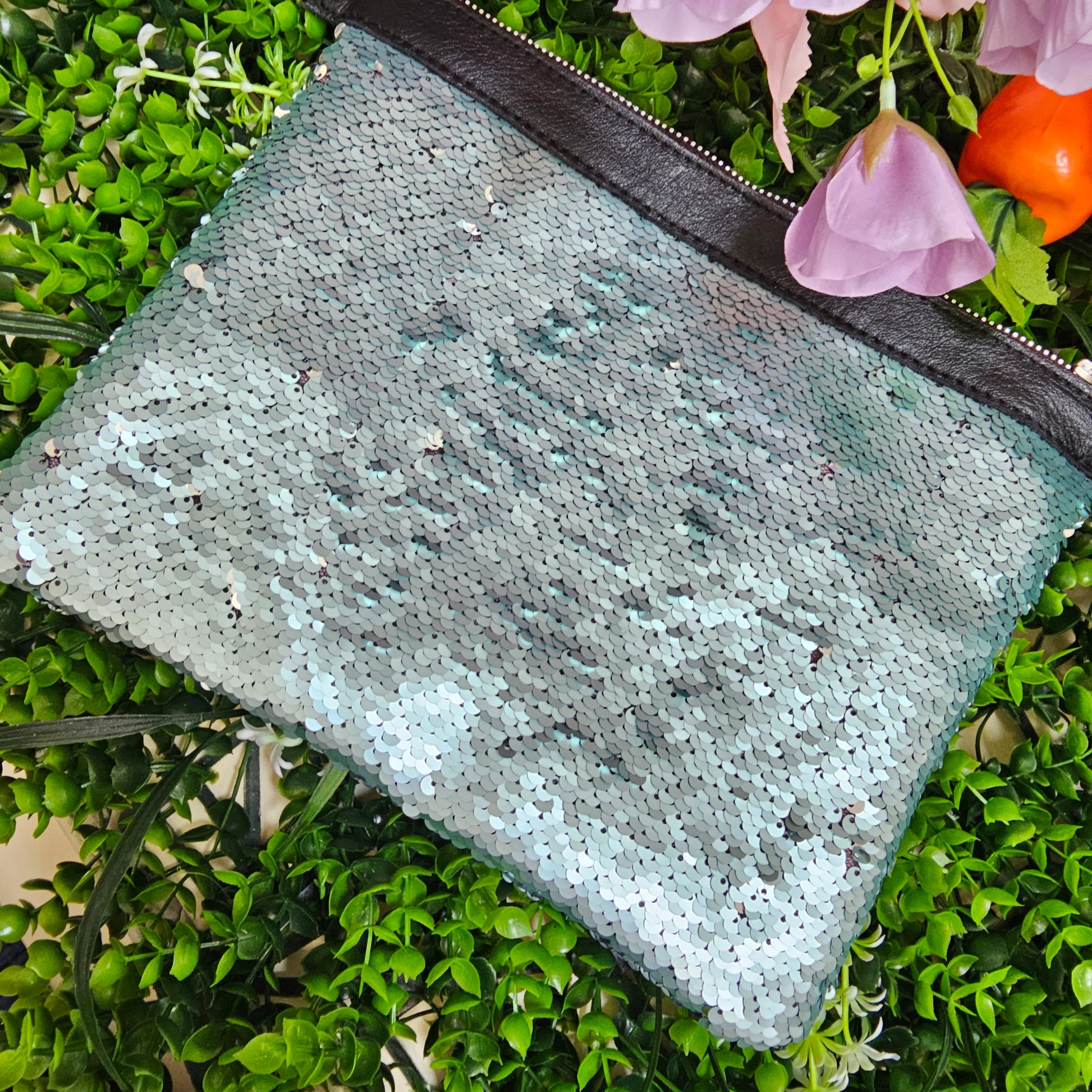 Stylish and sophisticated, this genuine leather pouch is adorned with shimmering sequins, adding a touch of glamour to any outfit. Perfect for a night out or a special occasion.