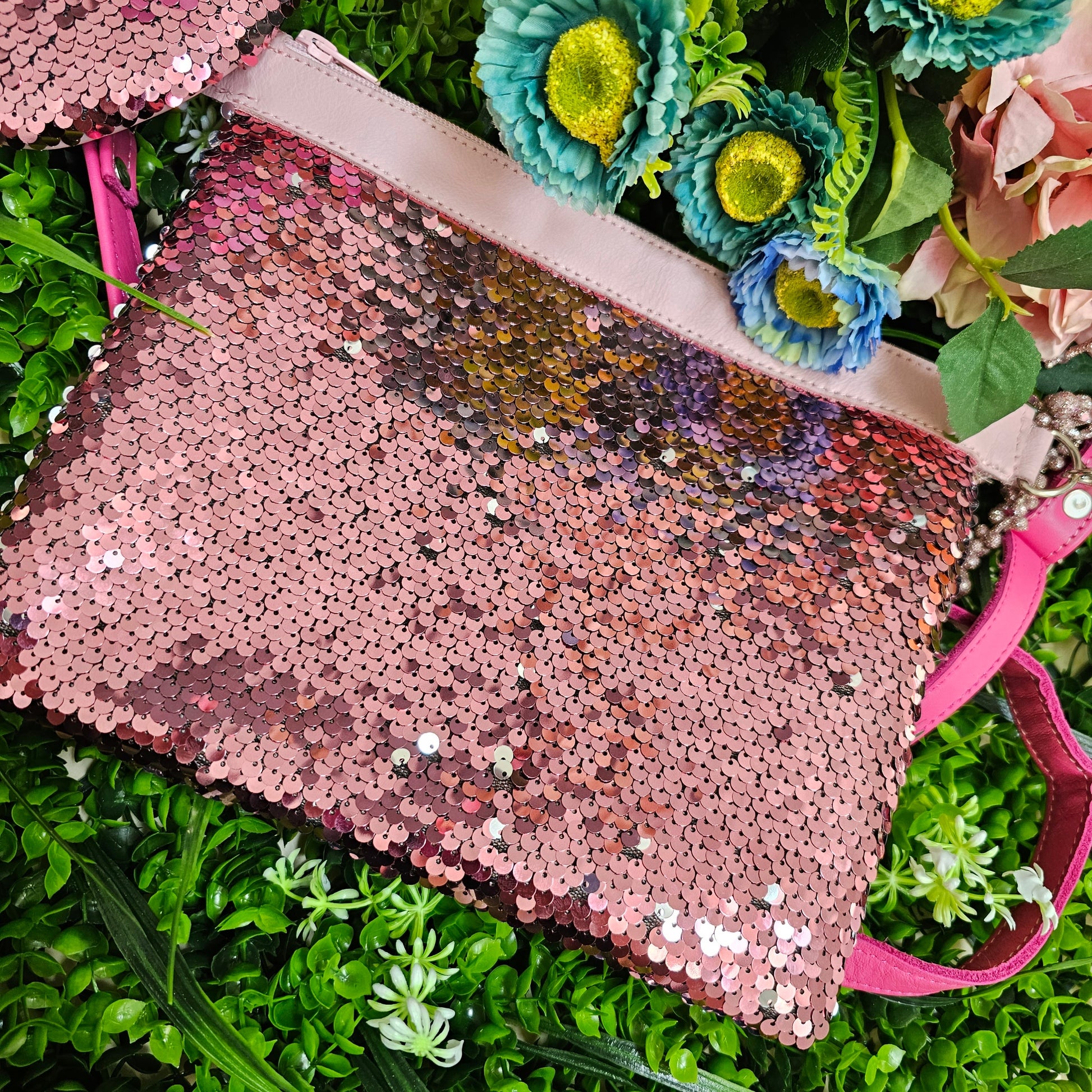 Stylish and sophisticated, this genuine leather Pooch is adorned with shimmering sequins, adding a touch of glamour to any outfit. Perfect for a night out or a special occasion.